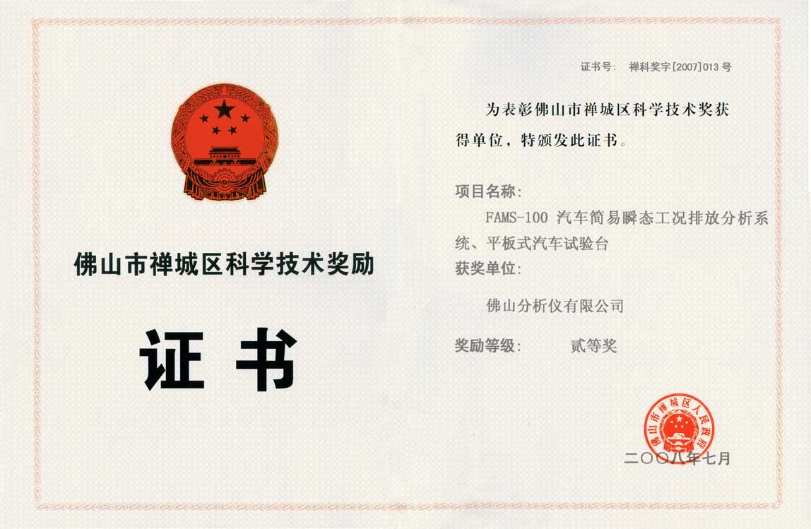 佛山分析儀有限公司的“FAMS-100汽車(chē)簡(jiǎn)易瞬態(tài)工況排放分析系統(tǒng)、平板式汽車(chē)試驗(yàn)臺(tái)”項(xiàng)目榮獲佛山市禪城區(qū)科學(xué)技術(shù)獎(jiǎng)二等獎(jiǎng)