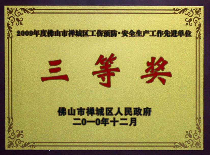 我公司榮獲2009年度佛山市禪城區(qū)工傷預(yù)防·安全生產(chǎn)工作先進單位“三等獎”。