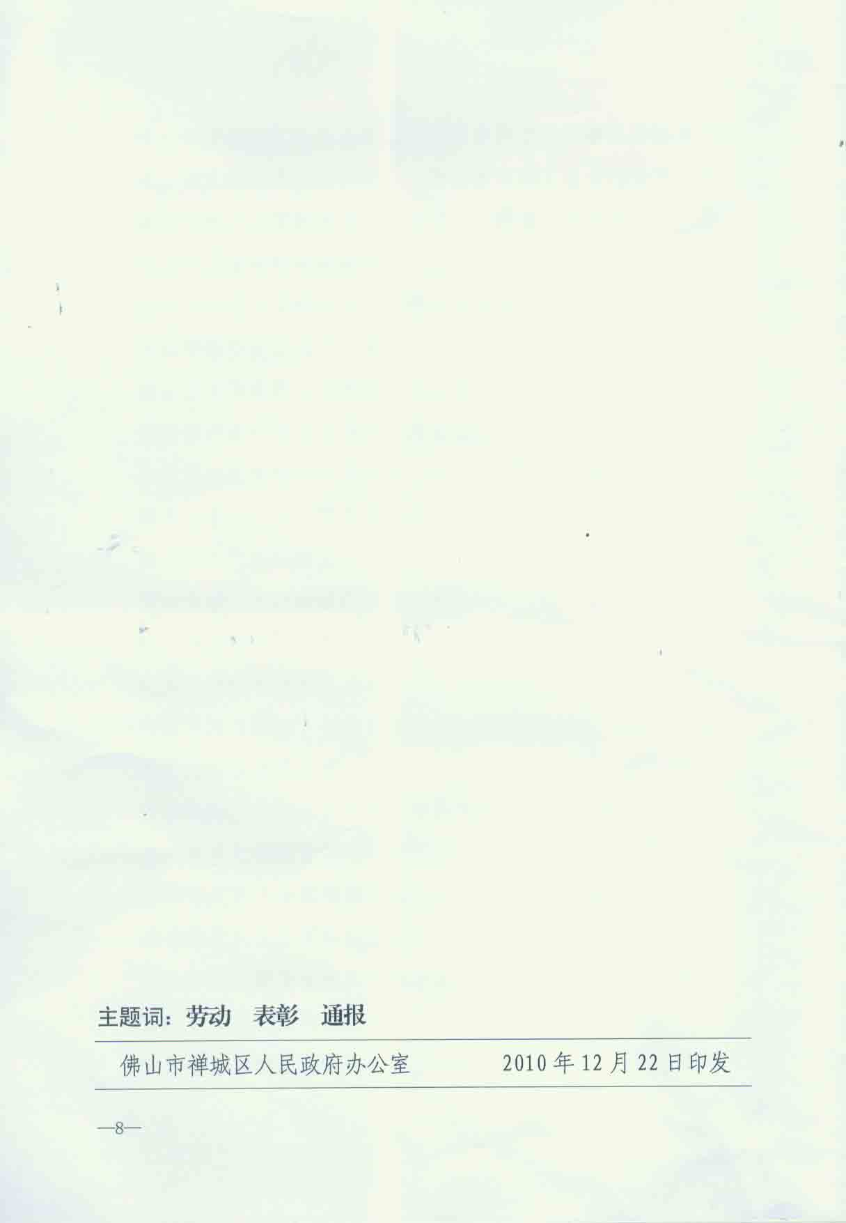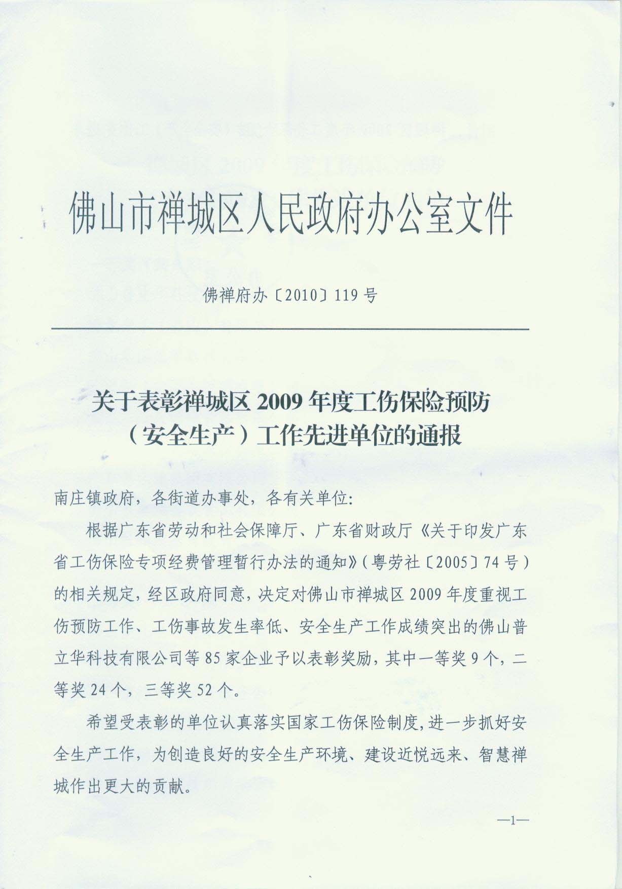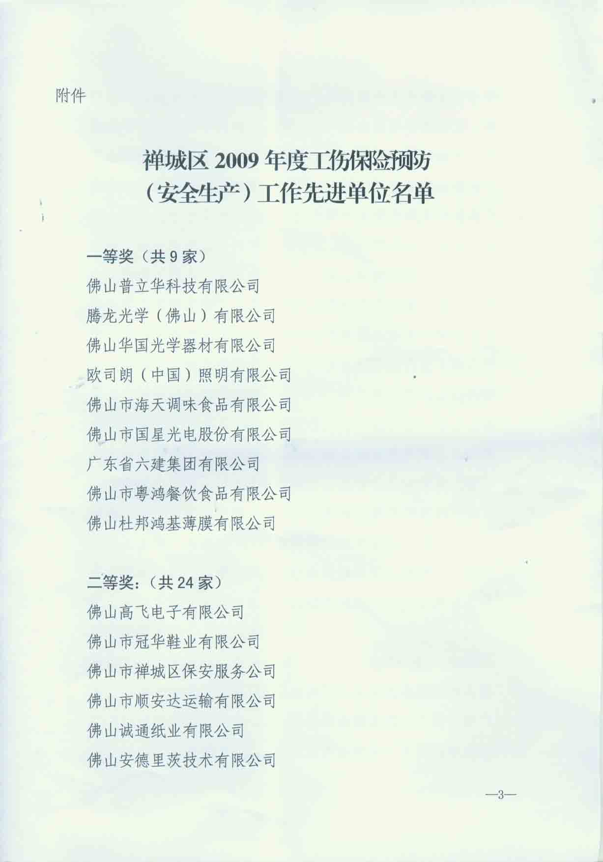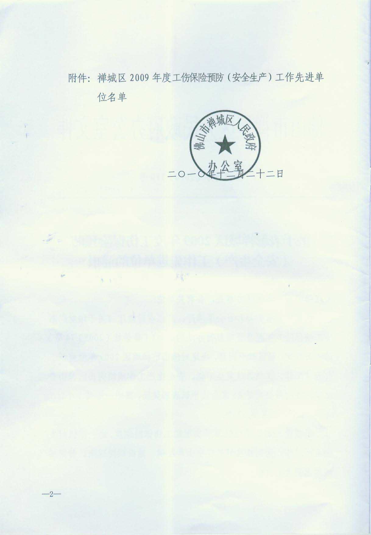 我公司榮獲2009年度佛山市禪城區(qū)工傷預(yù)防·安全生產(chǎn)工作先進單位“三等獎”