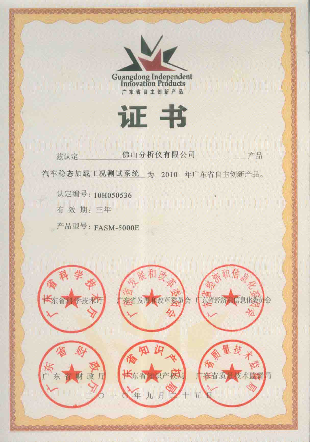 我公司"汽車(chē)穩(wěn)態(tài)加載工況測(cè)試系統(tǒng)"被認(rèn)定為2010年廣東省自主創(chuàng)新產(chǎn)品。
